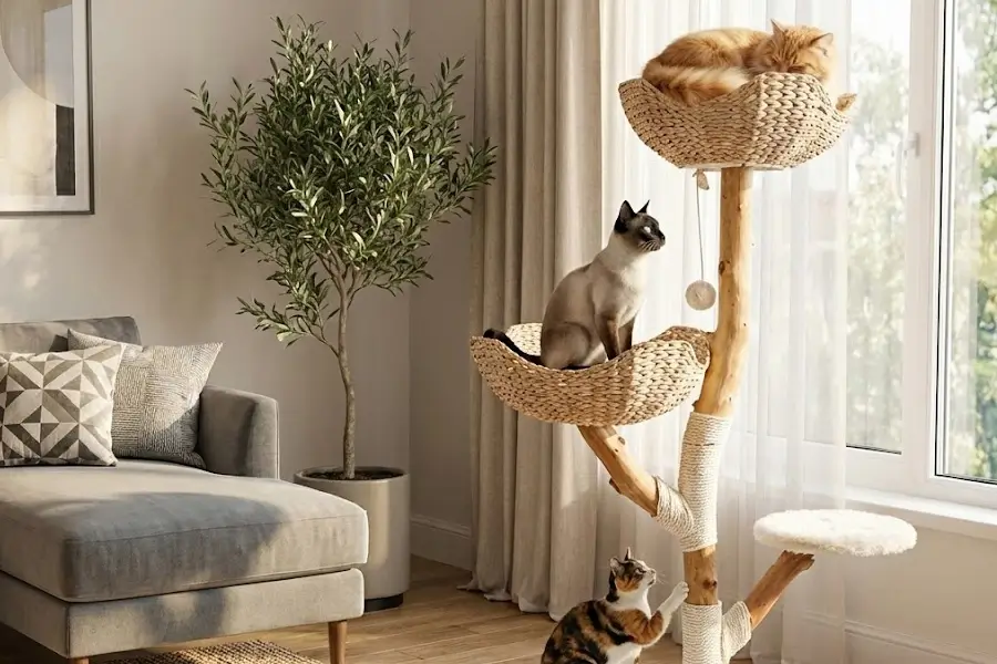 If you are tired of hiding your ugly, carpeted cat tower in the spare bedroom when guests come over, this product is effectively your permission slip to bring the cat furniture back into the living room. The Real Wood Modern Cat Tree is less of a pet accessory and more of a statement piece, blending “boho-chic” aesthetics with actual feline functionality. Instead of the standard cardboard tubes wrapped in beige carpet, this tower features genuine pear wood branches and hand-woven cattail baskets that look like they belong in a high-end furniture catalog.